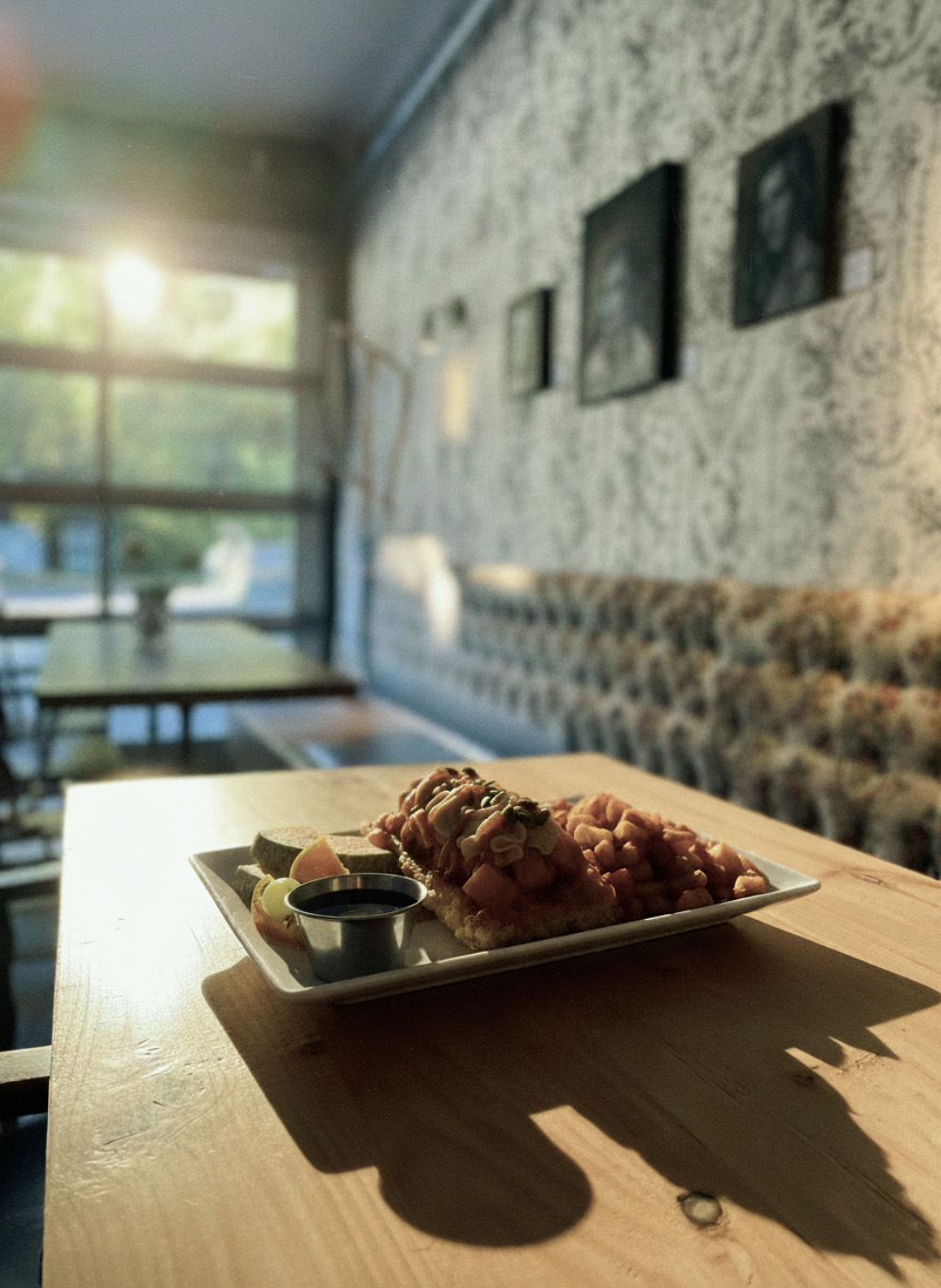 19,25$Crêpes farcies de légumes grillés, seitan façon jambon, cheddar ou fauxmage, œuf poché ou tofu brouillé, sauce moutarde à l'ancienne et érable